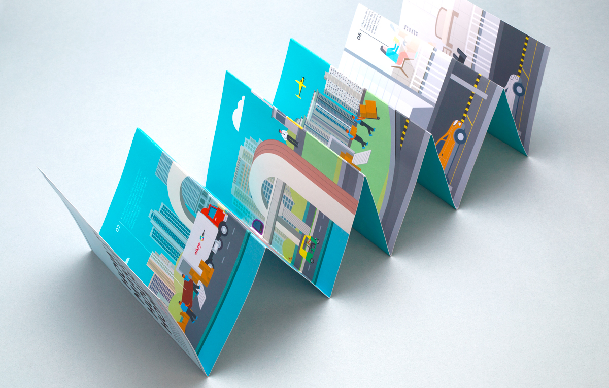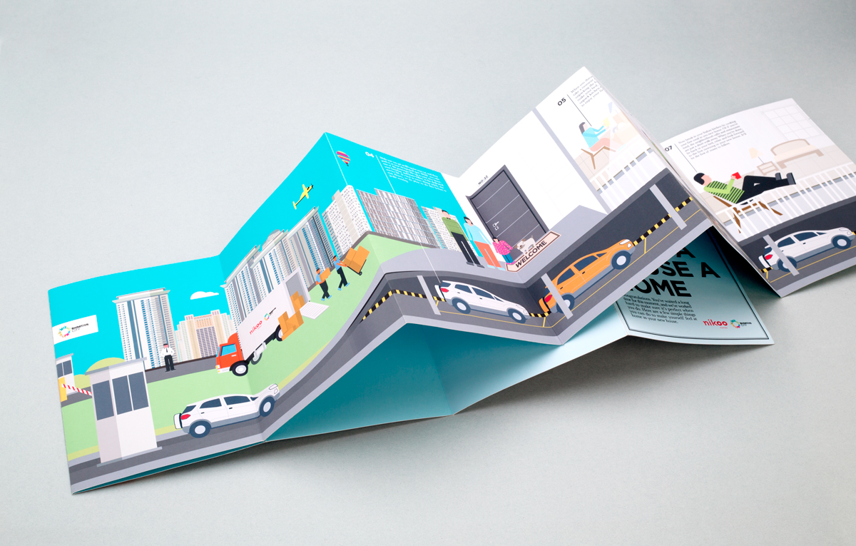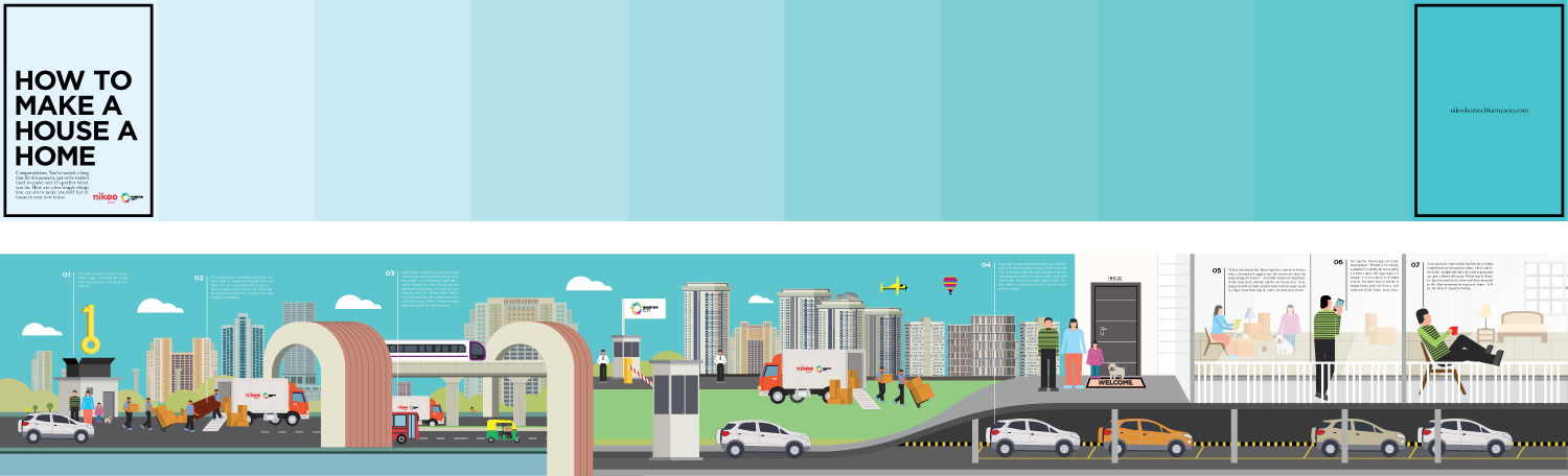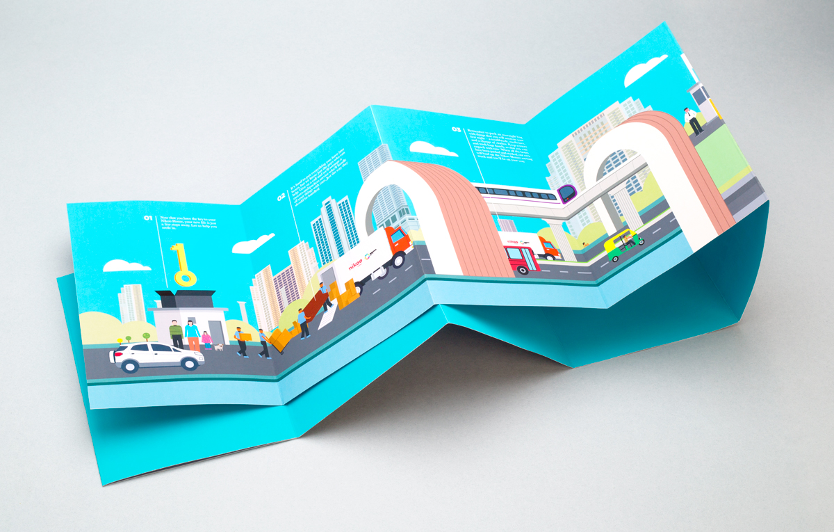 The process of moving from an old house to the new is an adventure. So why not turn it into a story? This 5-foot long illustrated fold-out maps the process a family follows when moving to Bhartiya City, and describes the various support services the developer offers to aid this.